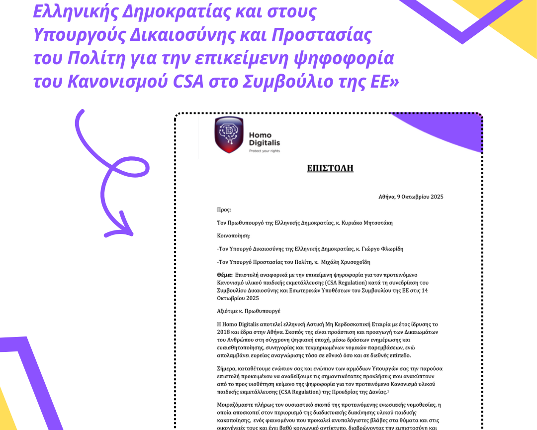 Μέσα από την ευαισθητοποίηση, τη συνδιαμόρφωση πολιτικών αποφάσεων και τις στρατηγικές νομικές δράσεις, προωθούμε & προστατεύουμε τα Δικαιώματα του Ανθρώπου στην Ελλάδα στο πεδίο των νέων τεχνολογιών.