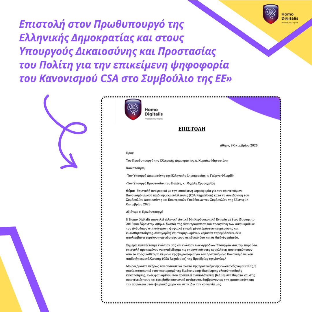 Homo Digitalis today submitted an Open Letter to the Prime Minister of the Hellenic Republic, Kyriakos Mitsotakis, regarding the proposed Regulation on Child Sexual Abuse Material (CSA Regulation).