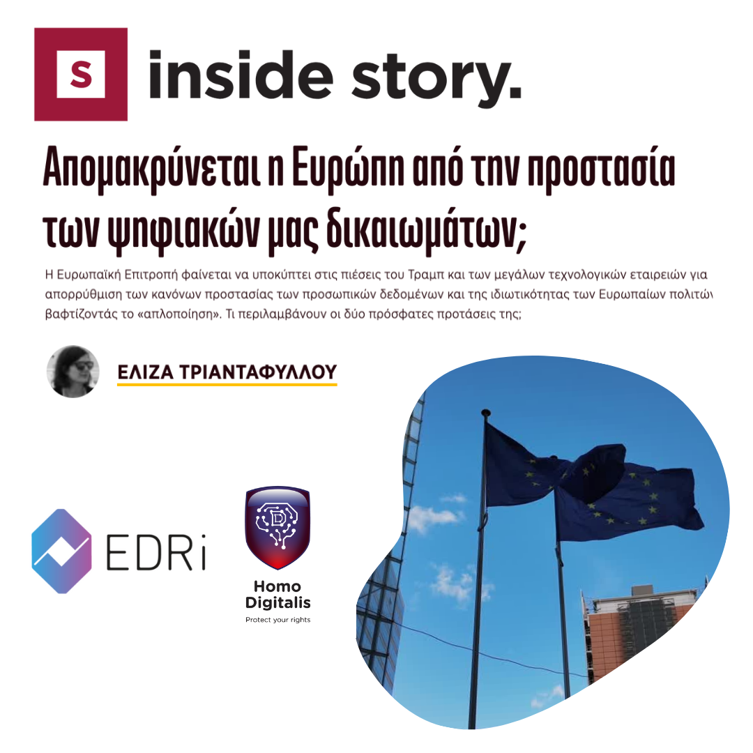 inside story. and journalist Eliza Triantafyllou published an in-depth article on Monday, December 1, examining the European Commission’s Digital Omnibus proposals. European Digital Rights (EDRi) and Homo Digitalis had the honor of contributing comments and arguments, represented by their members Blue Duangdjai Tiyavorabun, Ella Jakubowska (she/her), Itxaso Domínguez de Olazábal, PhD, and Eleftherios Chelioudakis.